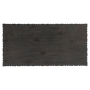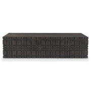 A raised geometric pattern wraps the Cowley cocktail table in a unique modern style. The table has a bold size and a smooth top, all finished in a moody Tadon finish. The table can be easily moved into place thanks to hidden casters.