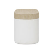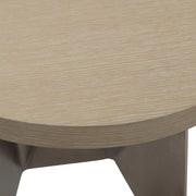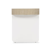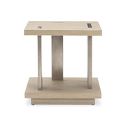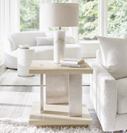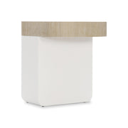 Architectural inspiration from the Bauhaus movement is evident in the Solaria side table. Designed to stand alone or pair with the Solaria cocktail table, this side table has a faux stone base and a top that extends out to one side in a Dune finish. The "flyover" style of the table also allows it to draw up snugly to a seat.