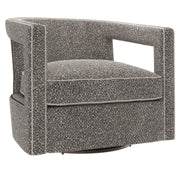 The sleek, sculptural design of the Alana swivel chair adds modern flair to an interior, blending seamlessly with contemporary and transitional styles. Two cutouts on either side are lined with nailhead trim for a crisp, polished look. Webbing construction and spring down cushioning provide luxurious comfort and support.