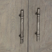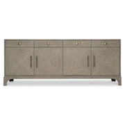 The casual style of the Albion entertainment credenza may speak softly, but it provides powerful high-tech additions. Designed for televisions and other media, the four fancy face doors open to reveal adjustable shelves as well as ventilation and cord holes to keep things organized. Four drawers across the top are perfect for remotes and other media gadgets. Both doors and drawers are accessed with textural cast zinc hardware with simple pulls on drawers and gorgeous bars for the doors.
