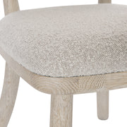 A softened shield back takes on a slight curve for comfort in the Anzu side chair. An exposed wood frame in the Flaxen finish supports an upholstered seat and lifts the back over an open space. It's a modern redesign of farmhouse styling that creates a contemporary rustic look.