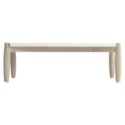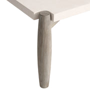 The Ashbrook cocktail table offers a stunning example of modern organic style. A wood top in the Vellum finish has scooped out corners, making it appear to float above the rounded wood frame. The table legs, finished in Weathered Greige, fit like a puzzle into the scooped out corners.