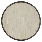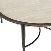 Exquisitely crafted, the Barclay round cocktail table features a thick white travertine stone top floating on a plated steel base in an antique pewter finish. The striking modern design features sculpted, tapered legs and semi-circular stretchers. This unique look delivers luxury with an eclectic edge.