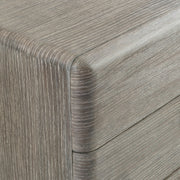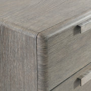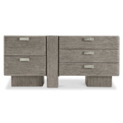 The Monolith dresser has a distinctive modern style with an offset vertical post between two sections set on plinths. On the left are two deeper soft-close drawers with cast aluminum tab pulls in Graphite finish. On the right are three longer drawers with the same beautiful hardware. The overall design has a deeply textured look in Puma finish.