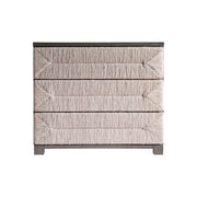 • Three push-to-open drawers wrapped in woven abaca in Light Grey Wash finish