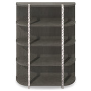 Gleaming textured metal posts define the front of the Prado etagere. Curved shelves balance the straight lines of the supports, with the etagere finished in Porcini. The bold structure offers a novel approach to modern rustic style.