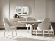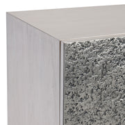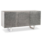 The luminous beauty of stone and textural wood are beautifully balanced in the Sereno buffet. The top and sides are crafted in walnut with a Lutra finish, while three drawers on the left and two doors on the right gleam in silver travertine fronts. The modern organic design is finished with two cast resin legs with a faux stone texture.