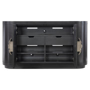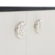 Silhouette is defined by bold contrasts, crisp tailoring and a hint of Hollywood Regency glamour. The Silhouette buffet has an elegant, luxurious feel. Its striking geometric design is highlighted by a frame in dark Onyx that starkly contrasts with its sleek Eggshell veneer. Inspired by camellias, ornamental pulls in brushed stainless steel add a soft, feminine accent.