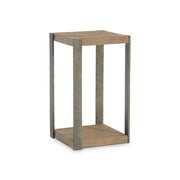 The Tribeca accent table melds modern design with rustic styling for a stunning look. Textured steel legs rise from the wood base to embrace each corner of the wood top. The wire-brushed wood is finished in Aurum.