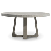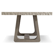 A modern organic design showcases the look of rough-hewn stone over a teak base on the Trouville dining table. The smooth top offers a chiseled edge and is finished in Sand Grey. The balance of natural materials is formed with two curving pedestals in loops of gorgeous teak connected by a stretcher base. The natural style, at home in an outdoor setting, is equally beautiful indoors.