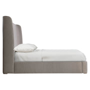 The Puro bed takes a traditional shelter design to new heights for comfort and style. The fully upholstered headboard wraps around at the corners and is supported by exposed wood feet in Smoke finish. Fully upholstered footboard and side rails continue the comfort story for a gorgeously inviting look.