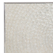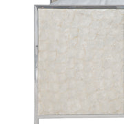 - Polished stainless steel framed headboard and footboard with inset capiz shell panel in starburst pattern