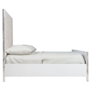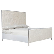 Future-forward and imaginative, the Helios bed features a polished stainless steel frame with a capiz shell headboard and footboard. The translucent capiz, fashioned in a striking starburst pattern, adds luminosity to any interior. Wooden side rails finished in Pure White contribute to the brightening effect.