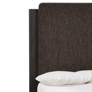 An upholstered panel on the Ludwig bed's headboard wraps up and over the wood frame, creating a unique textural style. The exposed wood frame is crafted of mahogany and finished in Bracken. The low footboard and deep side rails give this bed a bold modern profile.
