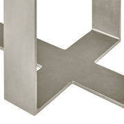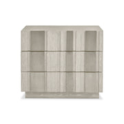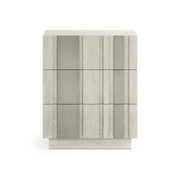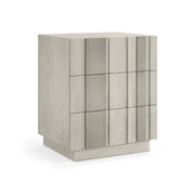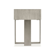 A pattern of metal and wood offers an interplay of light and shadow on the Tempo nightstand. Three raised-panel drawer fronts have sandblasted aluminum overlays in Satin Nickel finish over wirebrushed oak in Larza finish. High-tech details include a two-port A+C USB charging unit.