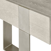 - Wirebrushed oak in Larza finish with smooth top and sides and raised panel drawer fronts with random sandblasted aluminum overlays in Satin Nickel finish