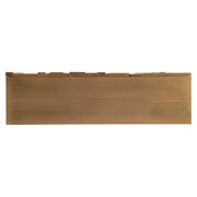 The wood frame of the Acora buffet, featuring three-dimensional door fronts, is wrapped in beautiful sheets of brass. Each seam is also finished with brass nailheads, giving the design a tailored detailing. Three soft-close doors open to reveal a glossy black interior that includes a drawer with a silver insert and two adjustable shelves.