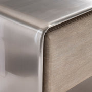 Inspired by jet set design from the '60s, the Lomond buffet has a brushed stainless steel modern form. Finished in Tarnished Nickel, it frames three push-to-open doors that appear to float within the rounded shell. Finished in Trevin, the doors open to reveal an interior drawer and two adjustable shelves.
