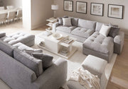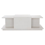 The Arnette cocktail table takes an architectural approach to composition and shape, offering visual variety and multiple surfaces for display. The multilevel top features a taller center section, while the extended base creates a shelf at the corners. Wire-brushed quartered oak veneers in white finish feature a linear wood grain for a look of understated luxury.