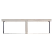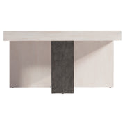 Architectural inspiration is evident in the Hoban cocktail table. Intersecting panels of wood in Weathered Bone finish form the top and center support, balanced on a frame of textured steel. The center panel fits into the top like the perfect puzzle piece.