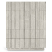 Rhythmic vertical panels of wood create a beautiful depth and dimension on the Tempo tall drawer chest. Crafted of wirebrushed oak in Larza finish, the chest has five push-to-open drawers. It offers a relaxed look with an elevated style.