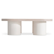 Shape and simple styling offer an uncomplicated form for the Turo cocktail table. Four cylinders form the legs in Fossil finish, supporting a rounded square, wire-brushed oak top in Bone finish.