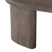 Cast resin takes on organic shape for the modern Bryant cocktail table. A teardrop shaped top has raised edges on two sides, resting on two curved supports. The design showcases a textured wood grain in the Aurum finish.
