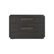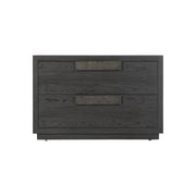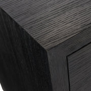 The Keali nightstand showcases straightforward lines and a strong geometric shape for a modern design on a plinth base. Bold and textured cast aluminum hardware complements the nightstand's shape on two drawers. And an Ebonized Pine finish creates a dark visual interest with depth.
