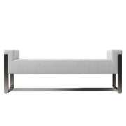 Modern geometry takes center stage in the Stratum bench. An open polished metal frame supports a unique upholstered seat that overlaps the nickel-plated steel sides.