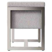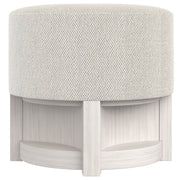 The Stratum bench showcases a distinctive wooden base formed with curved sections and straight lines and finished in Mist. The geometric design supports a round seat with an upholstered top and sides.