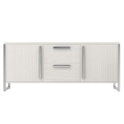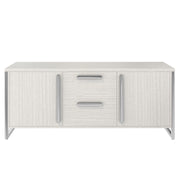 The Stratum buffet offers a hint of glamour with the gleam of polished metal from open end frames and sleek hardware. A beautiful wood grain pattern comes through in the Mist finish. Two soft-close doors and two center drawers provide ample storage.