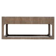 There is an ageless authenticity to the Casa Paros cocktail table. It makes a bold statement with a wood frame in Playa finish and inset faux concrete top in Bedrock finish. But the unique open sides and soft shaping add the fresh originality that is a signature of this collection.