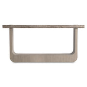 The wood sides of the Azzura console table flow into a rounded base and form a lower shelf. The side panels pierce the stone top, offering a unique style for this modern organic design.