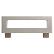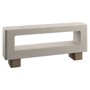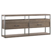 Understated tactile materials craft an original design with the Casa Paros console table. Two extendable, sliding trays and two drawers float within a metal frame. The top and base offer two more wood shelves, all in Playa finish. Cast metal hardware complements the organic and rustic styling.