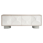 Boldly dramatic design is brought to life in the Lunula entertainment credenza. Cast resin creates a textural surface with dimensional forms that captivate and engage. A wood frame in a Flaxen finish embraces the exuberant look, while cast and chiseled concrete bases support the elemental vision. Four soft-close doors open to showcase ample storage.