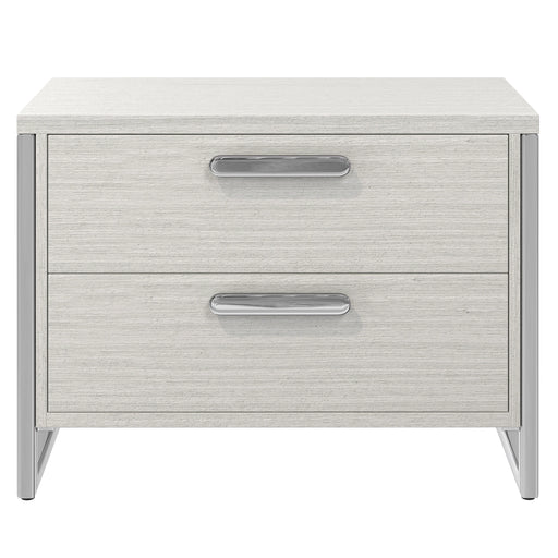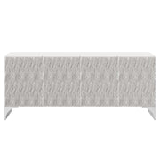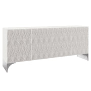 The Stratum entertainment credenza's sculpted cast resin door fronts showcase an intricate pattern inspired by the movement of wheat fields. Behind four pull-to-open, soft-close doors are fixed and adjustable shelves, vent holes and a drawer. The sides and top are finished in a Fossil white faux stone finish, and the base sits on two steel base panels in a Polished Nickel finish.