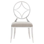 In a class of its own, the Fillmore side chair is best described as a throne chair with a distinctly modern twist. The brilliant stainless frame features an oval back with an open diamond design. A comfortable upholstered seat pairs elegantly with the sleek metal. Fun and extravagant, this eye-catching chair steals the show.