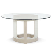 With a clean, modern form and combination of finishes, the Axiom round dining table offers glamorous transitional style and unique visual appeal. In this sleek, geometric design, a round glass top with an eased edge rests on an open circular base with four leg posts. On the base, engineered faux anigre veneers are presented in two silky, low-sheen finishes that work together to create texture and depth. The result of fine craftsmanship, this piece delivers contemporary elegance with a warm and inviting feel.