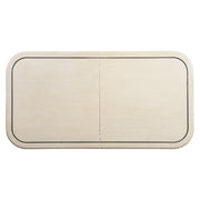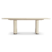 The Brigitte dining table is inspired by vintage style and showcases a stunning modern glamour. Rounded base panels have polished stainless steel feet and support a table top with rounded corners. The top offers a glam detail with a stainless steel inlay that complements the table's Ecru finish.