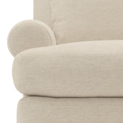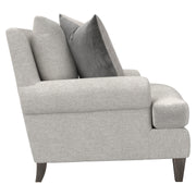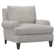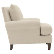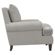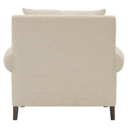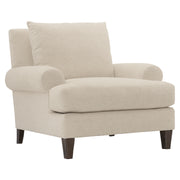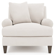 The Isabella chair exudes comfort with its deep, luxurious seating and plush down cushions. Rolled arms sit low against the square back, emphasizing the gracious scale of this transitional piece. For contrast, tapered wooden legs balance the soft, casual design.