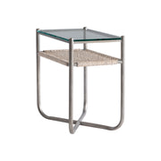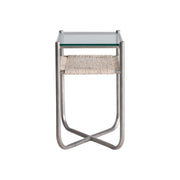 Glass, metal and natural fibers combine for a modern organic design in the Kendo accent table. A woven abaca shelf sits under a tempered glass top, adding a layer of chic texture. The steel frame has rounded corners and an X-shaped base finished in Graphite.