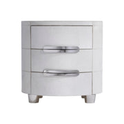 White hair-on-hide gives a distinctive texture to the Lyric nightstand. Three soft-close drawers add a quiet glow with the metal hardware, also reflected in the four tapered stainless steel feet. A glass top is also included to protect the surface of the nightstand.