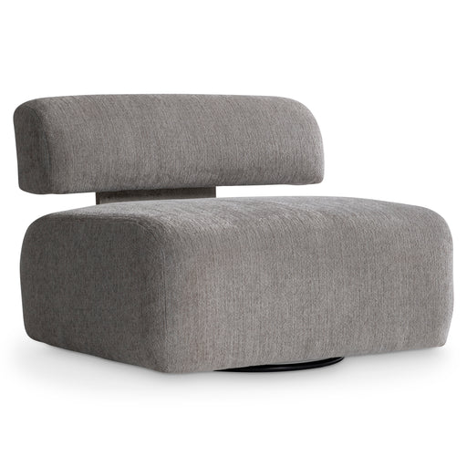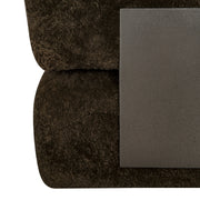 The curved back on the Paley swivel chair appears to magically hover over the deep seat and smooth swivel base. A glimpse of silver reveals the modern mystery as a textured metal panel connects the luxurious real shearling-upholstered forms along the back. The design is a work of art, both comfortable and stunningly beautiful.