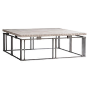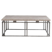 The Riverton cocktail table's design finds its inspiration in the Arts and Crafts period, with simple lines that celebrate form and style. Metal bars interlock for the base, allowing a honed Bianco Travertine laminated stone top to float above the frame.