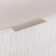 The Solaria file credenza makes a quiet statement with architectural style. Two bottom file drawers are topped with metal supports that lift two smaller drawers. All drawer fronts feature the chiseled cast resin patterns that are the iconic hallmark of the Solaria collection. Quartered white oak veneers are finished in Weathered Bone, while metal accents shine in a nickel finish.