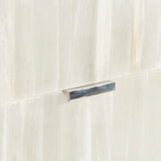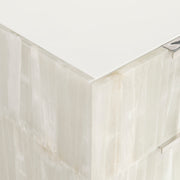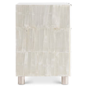 Selenite crystals wrap the Salka nightstand, adding a soft glow of shape and style. The top and interior are finished with white lacquer, while the drawers are accented with polished stainless steel hardware. The back features an A+C USB charging system.