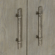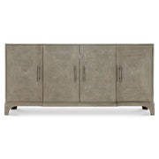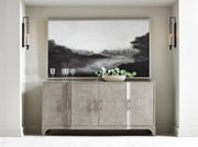 The Albion buffet showcases compelling style with its fancy face pattern in a Pewter finish. A versatile interior means that the buffet can be used as dining storage or an entertainment unit, including a silverware insert and cord access points. The center soft-closing doors project slightly forward in a subtle shaping inspired by traditional breakfront designs.