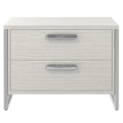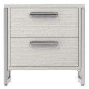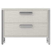 The Stratum nightstand offers a bit of glamour with the gleam of polished metal from open end frames and sleek hardware. A beautiful wood grain pattern shines through in the Mist finish. Two soft-close doors provide storage while function comes from a two-port USB charging unit on the back.