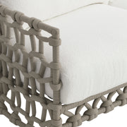 An open weave crafted of rope in a Shiitake finish twists a sophisticated pattern around the Nodi sofa. Comfort is key in this outdoor design with deep seat cushions and loose back pillows. The result is a sofa that is sophisticated enough for indoor settings, but created with materials to withstand outdoor elements.