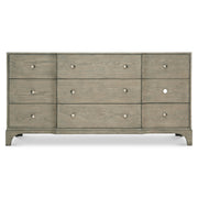 Traditional design finds a modern interpretation in the Albion dresser. The breakfront style, with a center panel that projects forward, is softened with clean lines and a gorgeously worn finish. Nine soft-closing drawers showcase rustic cast zinc hardware with texture and a soft sheen.